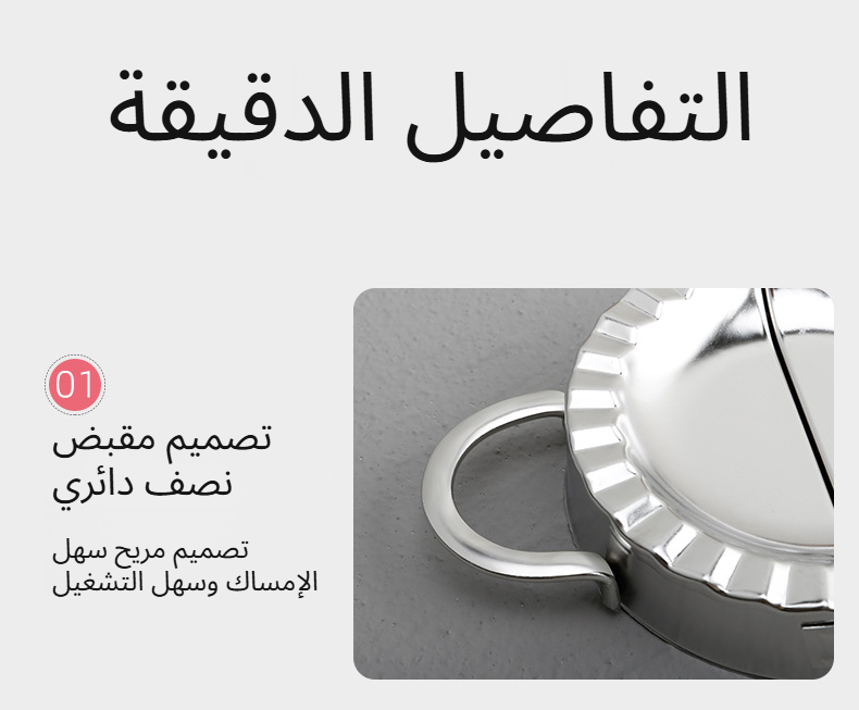 ● مصنوعة من الفولاذ المقاوم للصدأ عالي الجودة 304، مما يضمن متانة طويلة وسهولة التنظيف بعد كل استخدام في المطبخ. ● تصميم فعال يساعدك على صنع الهلالات بشكل مثالي وسريع، لتوفير الوقت والجهد أثناء تحضير الحلويات والمخبوزات. ● أداة عملية وآمنة للاستخدام اليومي، مقاومة للصدأ والتآكل، وتتميز بمقبض مريح يضمن سهولة التحكم أثناء العمل. ● مثالية لعشاق الطهي وصناعة الحلويات المنزلية، تمنحك نتائج احترافية وتجعل تجربة الطهي أكثر متعة وإبداعاً. ● حجم مناسب وسهل التخزين في المطبخ، كما أنها تناسب جميع أنواع العجائن وتساعدك في تحضير أشكال متنوعة بكل سهولة.